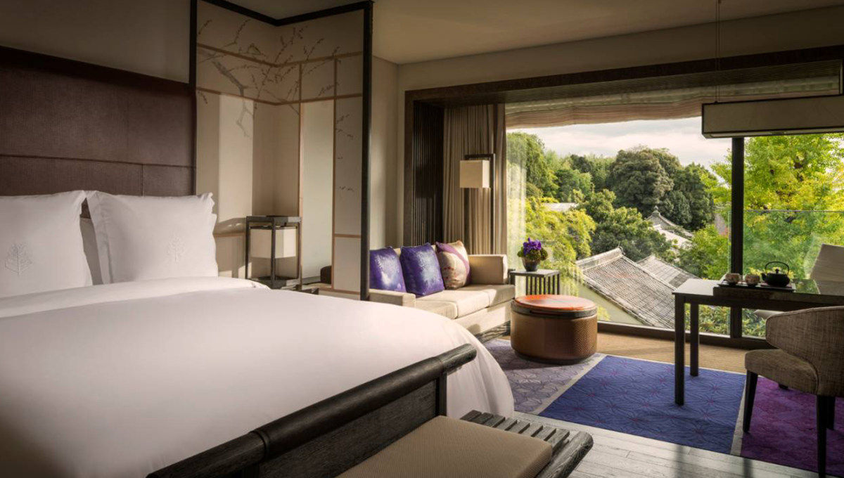 酒店123间客房的内饰沿袭了传统日式的极简风格,以简约的线条和陈设为主;沿着小径走过玻璃桥,便来到了拥有800年历史的幽静绿洲——积翠园。为了不破坏这座百年庭园,酒店沿园而建,身处每间房内都能将四时山水流韵尽收眼底。