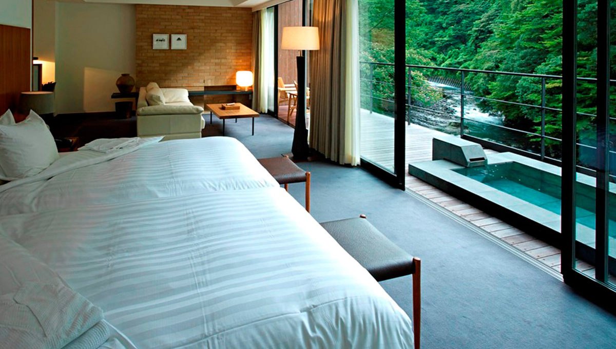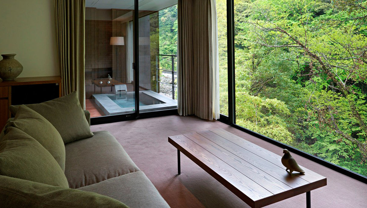 这里虽然是日本温泉酒店,但装修和主题完全打破传统日式风格,简洁自然是这里的关键词。这个空间没有国界,主要是为了能让客人有足够的空间,时间,视觉,味觉去品尝大自然。