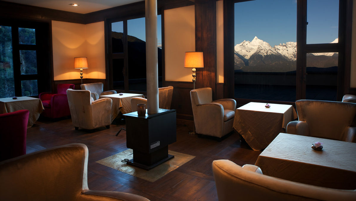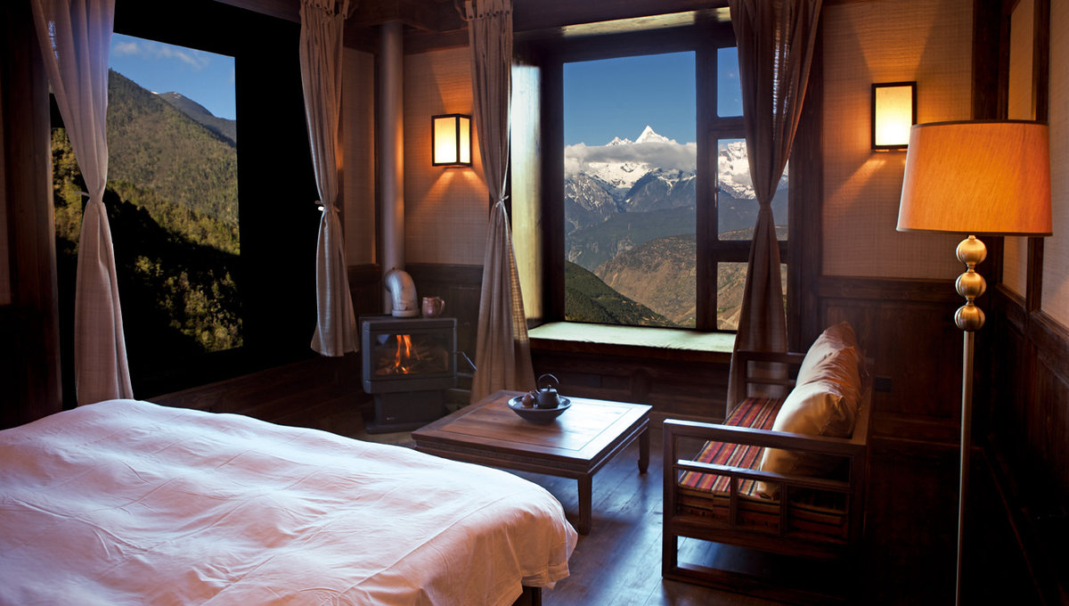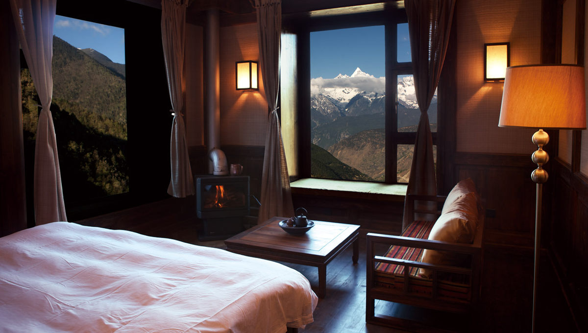 梅里酒店的设计尽量使每一个房间都看得到神圣的梅里雪山。每天员工会早早在书吧升起炉火,安排早餐,因为在这里你可以欣赏到难得一见的日照金山的景色。而晚餐也可以安排在露台上,守着炉火享受藏式美食的时候,雪山就赫然出现在眼前。如果天气晴好的时候,酒店会不定期组织篝火晚会。