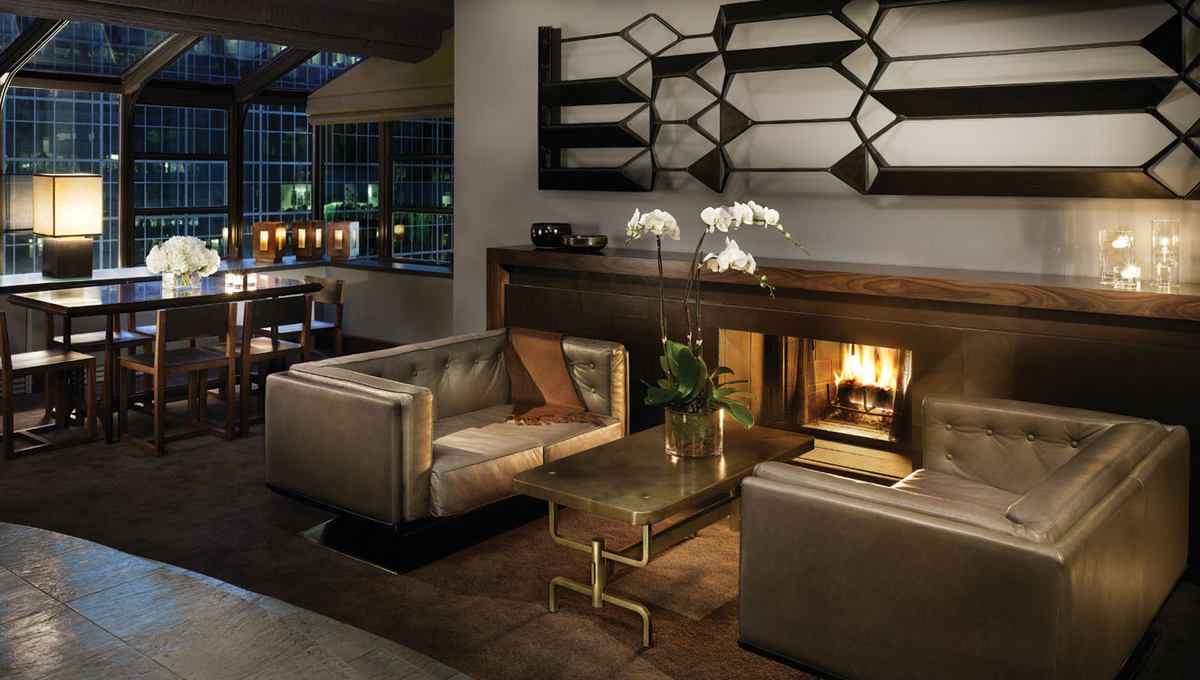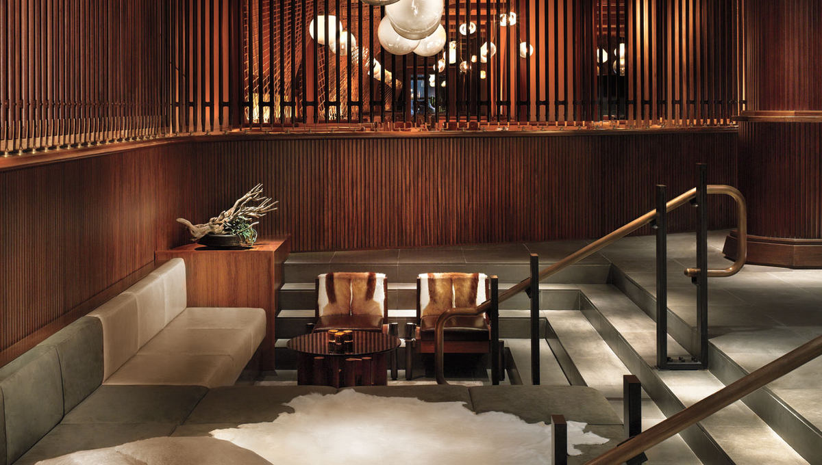 酒店大堂被打造成了充满诙谐与感性味道的时尚客厅,狂野的黄铜家具搭配小山羊皮靠垫,厚重的皮质墙壁搭配兽皮包裹的沙发,在设计师营造的暗调、性感、奢靡空间里,处处有值得细细品味的角落,庞大的双面铜质壁炉从地板一直延伸到天花板,曾经是法国某建筑外观的宽20英尺的屏风,手工缝制的皮质墙壁,纯手工绘制的非洲部落图腾作品,无论是空间格局还是装潢设计,都体现着细腻繁复与粗狂冷峻并存的独特风格。