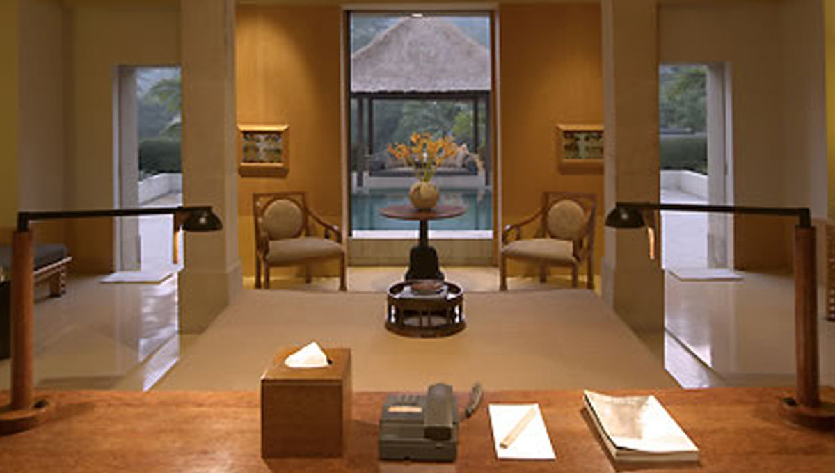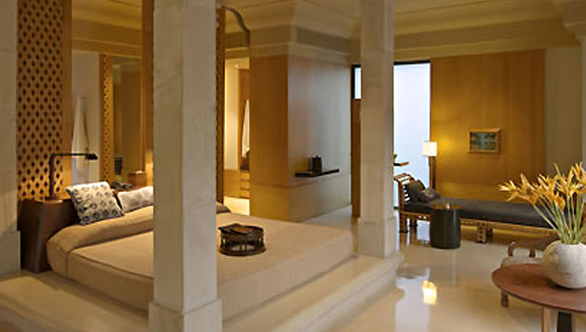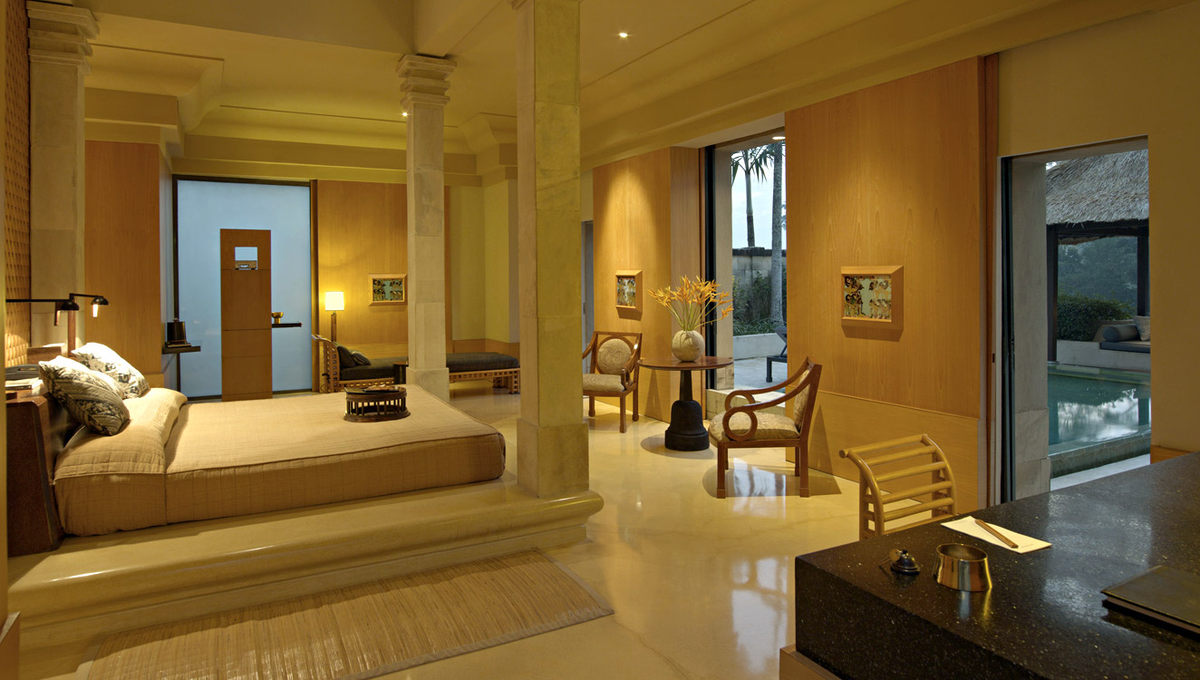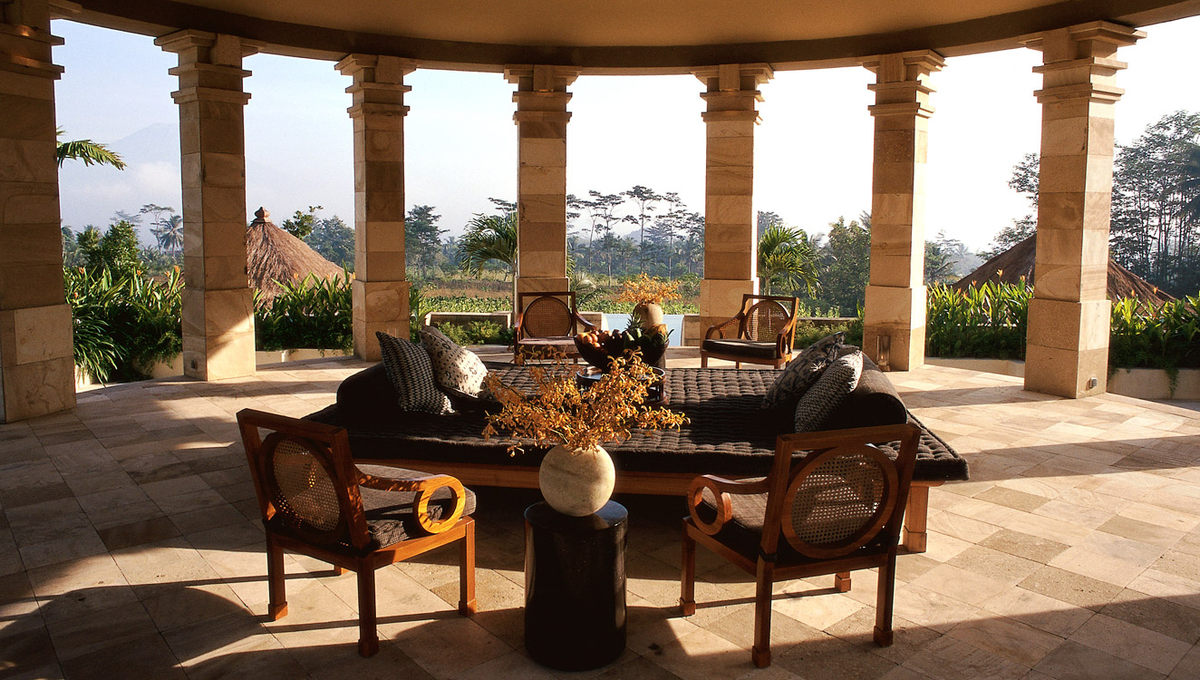 安缦吉沃共有35间独立的宾舍,这些独院别墅如环绕着酒店标志性的穹顶主楼,其间以错综的巷道与华美的台阶串联。无论身处酒店的餐厅、走廊、泳池,还是客房前的卧榻上,总是能望到婆罗浮屠的塔顶,所以前往婆罗浮屠的人们,总是会说这里有着欣赏名胜的独特视角。游荡在度假村之中,那些在云雾和晨光中隐隐若闲的火山群是爪哇的圣山;而水磨石的运用,又让人想起不远处古老的神庙,就连宽敞的房间内也有水磨石的身影——位于客房正中央的水磨石台上摆着四柱床,这让睡眠也成为了一种仪式,倍感神圣。酒店不设围墙,周围村庄的小孩常跑进酒店玩耍,在酒店的泳池也能看见农民在田地里劳动。于是你又从神殿的瞻仰情绪中被拉回现实,陶冶在田园乡间质朴的气息中。你可能会突然兴起,提笔作画或撰写一篇小文,或者只是乘凉发呆,但这都是再自然不过的事情了,仿佛你在安缦吉沃里,就应当这样生活。