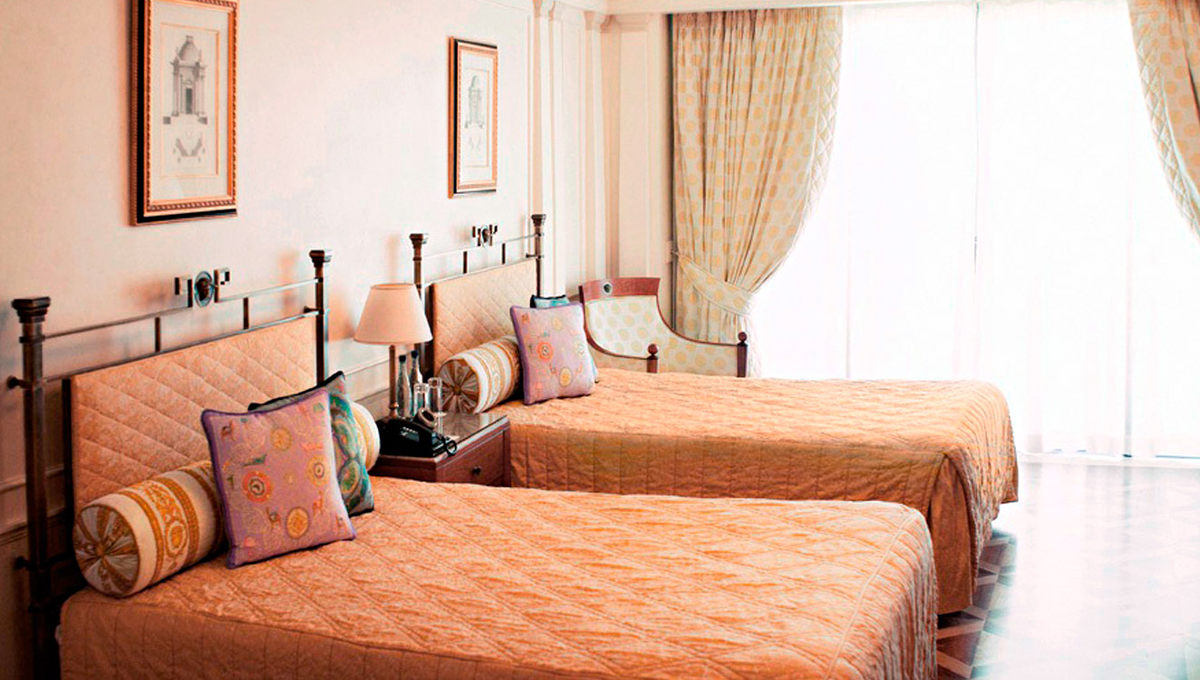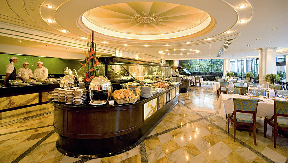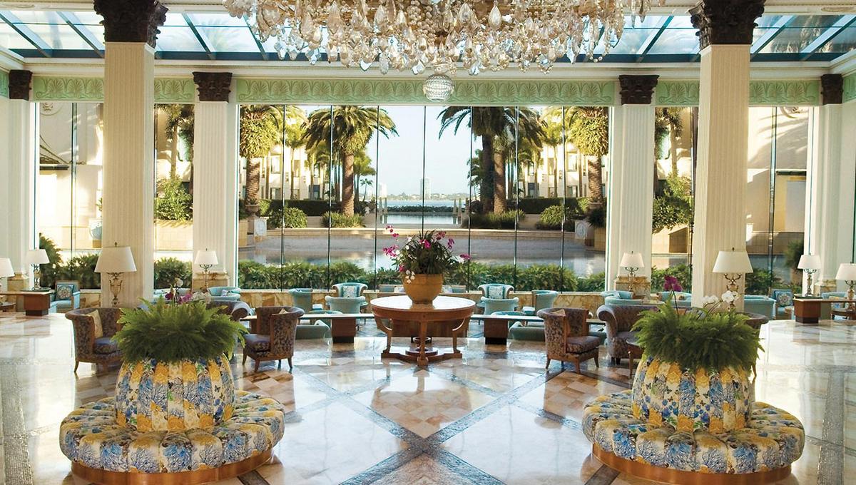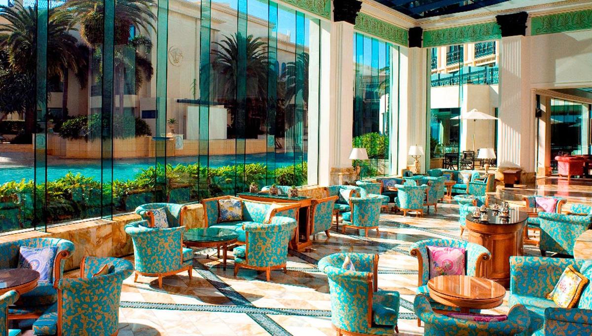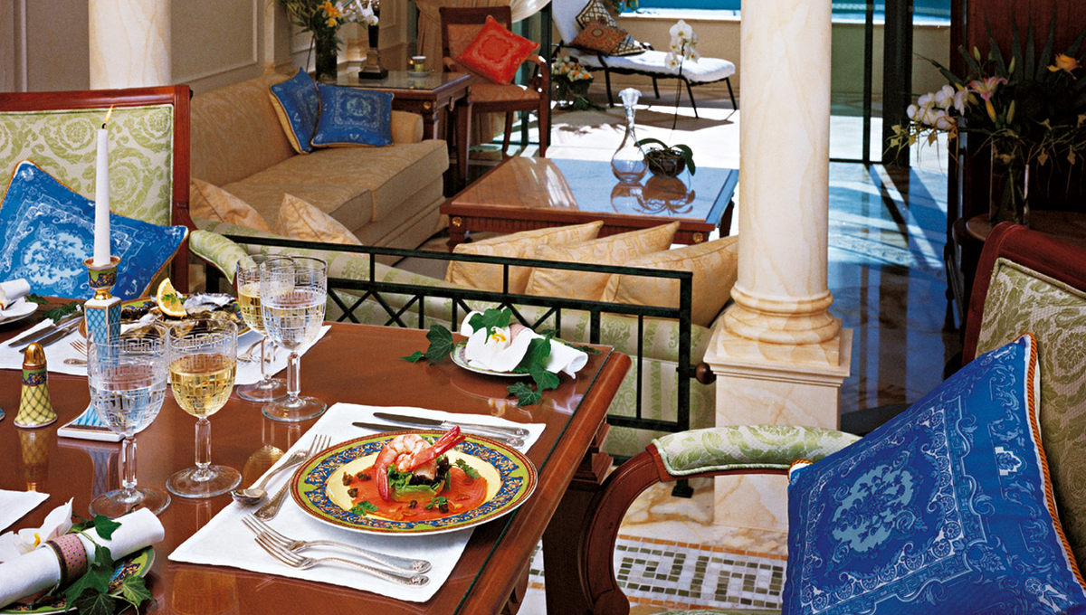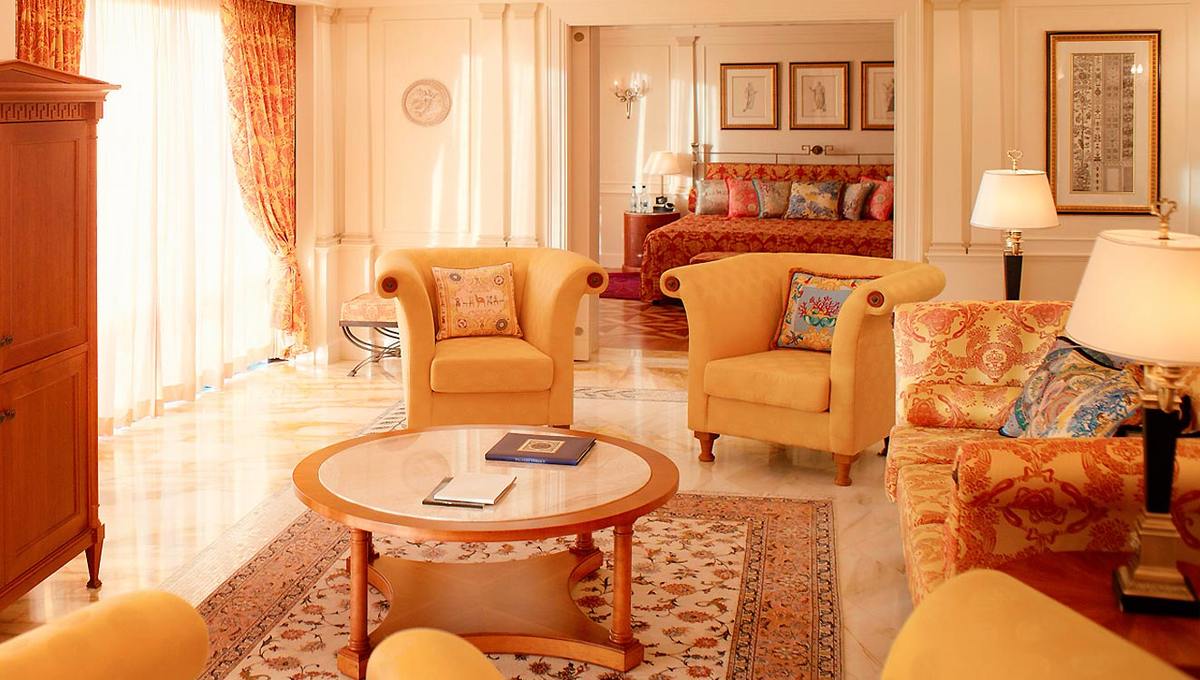大厅里有宏伟的立柱、装饰华丽的天花板、意大利式马赛克和一盏炫目的750 公斤重的枝形吊灯,步入这座闪亮夺目的宫殿,就像走进了一个文艺复兴时期的大型而精美的艺术品之中,那华美的天花板、外墙、柱廊、拱门及油漆令人回忆起十七及十八世纪欧洲贵胄的豪华大宅。每一件摆件背后都有它独特的故事,像那盏古老的水晶吊灯,原先存在于米兰州立图书馆,范思哲先生发现它后几经周折才买到手,放在家中的别墅里悬挂。待他去世后,家人才将这座水晶灯放在了酒店大堂。