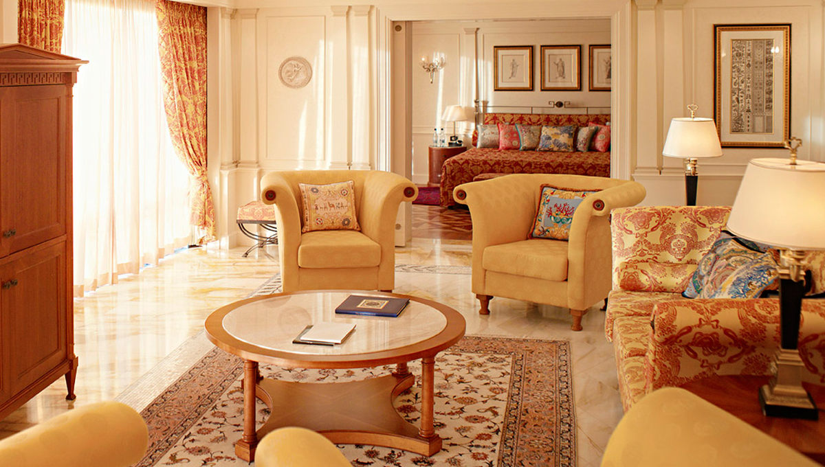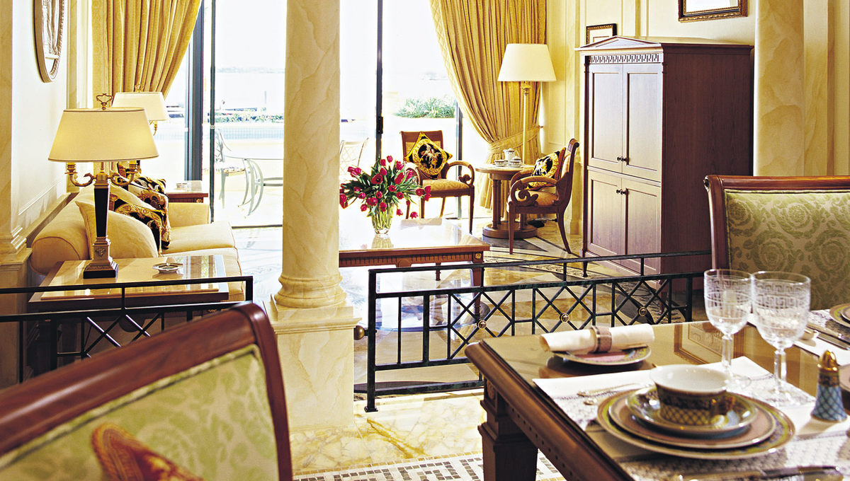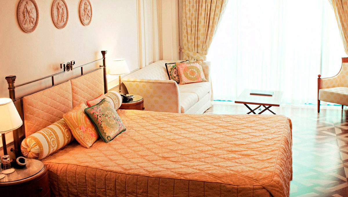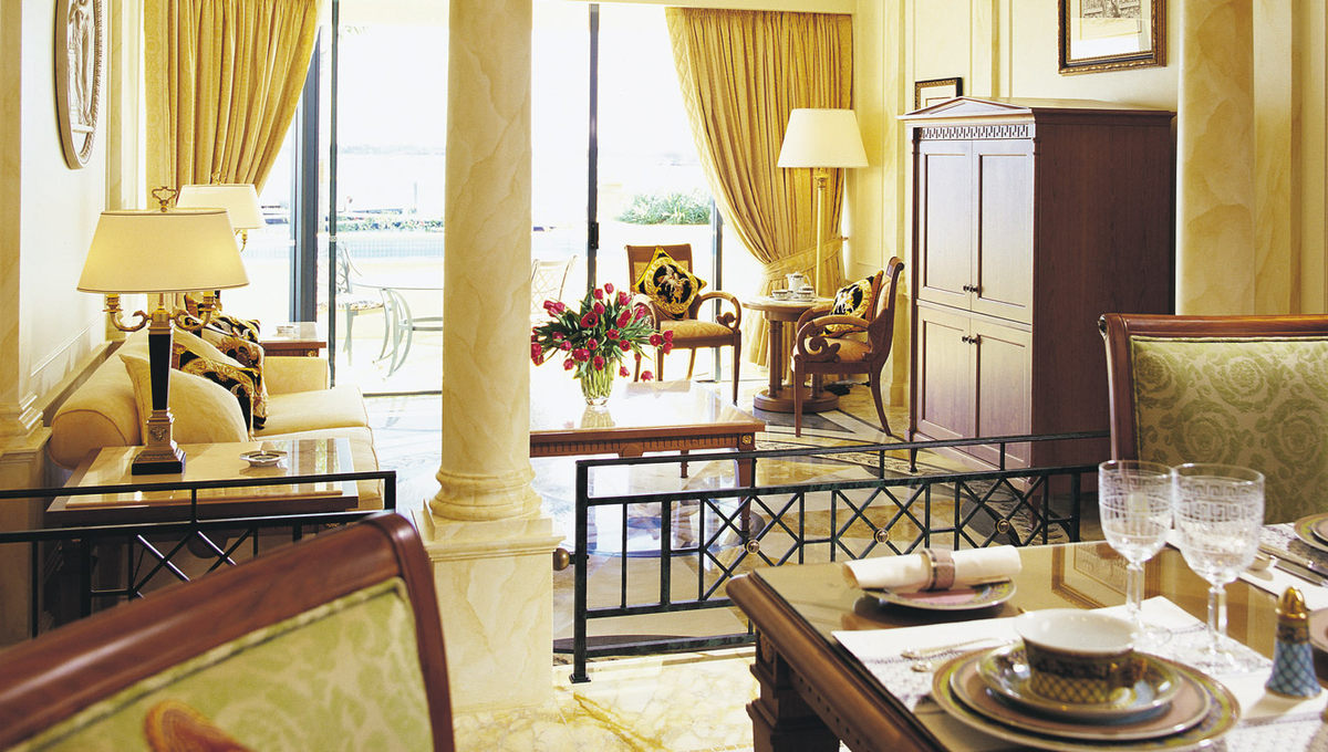 内饰设计上也早成为了超越欧洲奢华的存在:七彩斑烂的色彩组合及衬布,营造出官能上的享受,整座酒店都令人赏心悦目;客房内的装饰屋顶,装饰墙壁,以及Versace采用的大量时髦丰富的色彩和纺织品装点着房间,呈现出令人瞠目的缤纷世界。