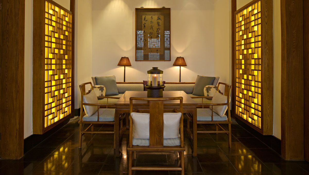 | 安缦赏悦亭皇家晚宴,每晚只可接受一桌预订,可选中式或西式菜单,中国传统音乐演奏,私人侍者,浪漫布置 |