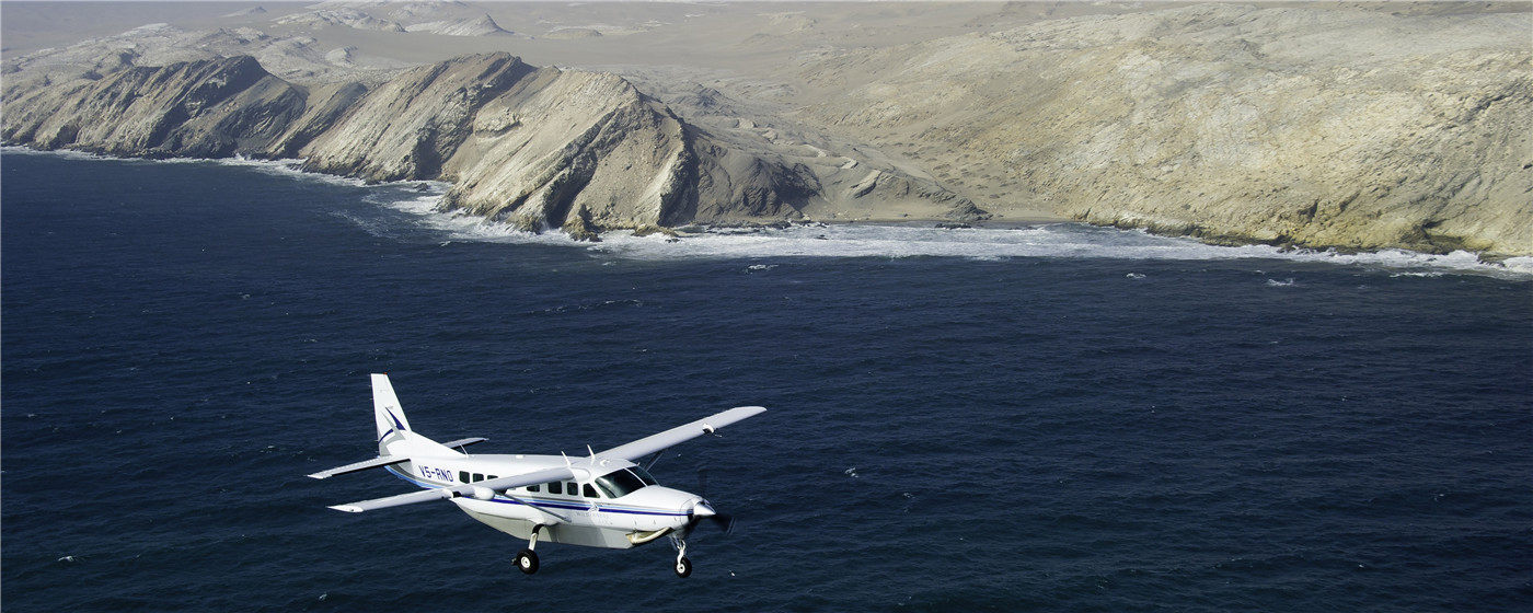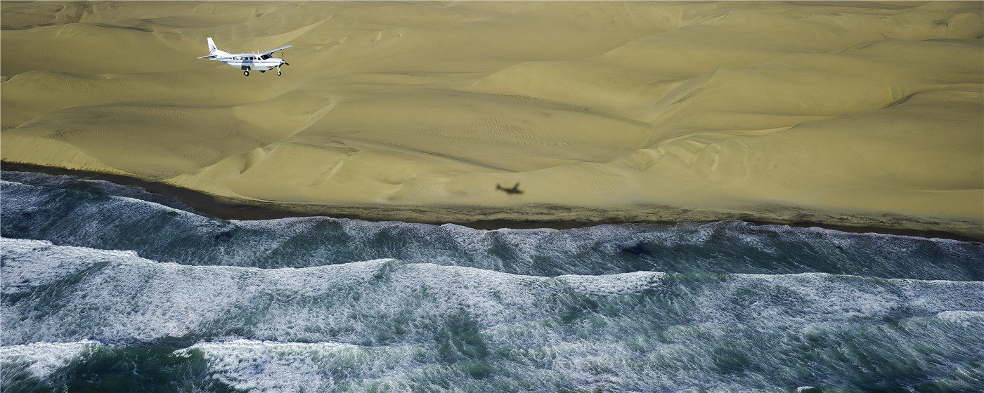 全程观景轻型小飞机接驳,免去舟车劳顿和尘土飞扬,更能在空中观赏茫茫大漠与浩瀚海洋交汇的无敌景观。坐小飞机航拍骷髅海岸是绝佳体验,从空中俯瞰,骷髅海岸是一大片褶痕斑驳的金色沙丘,从大西洋向东北延伸到内陆的沙砾平原。沙丘之间闪闪发光的蜃景从沙漠岩石间升起。围绕着这些蜃景的是不断流动的沙丘,在风中发出隆隆的呼啸声,交织成一首奇特的交响乐。有时从海面上升腾起朦胧雾气,飘过的云彩在沙漠上投下阴影,阳光透过云朵撒在沙丘上,呈现出金红色,如神光一般迷人。