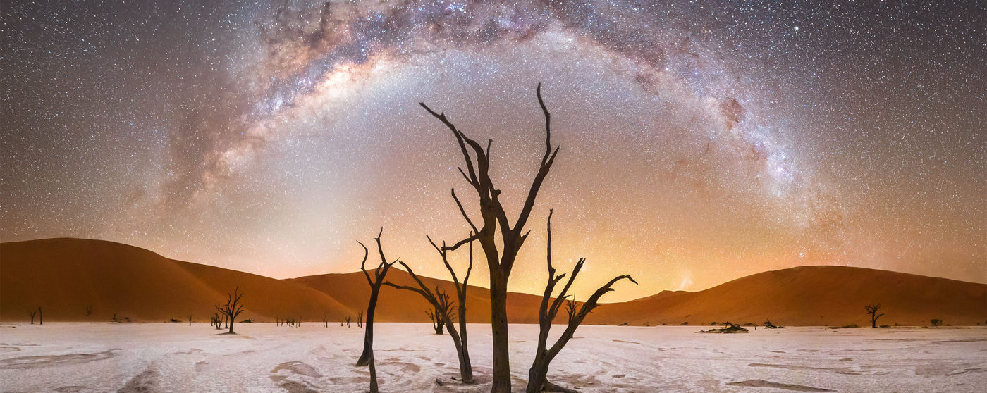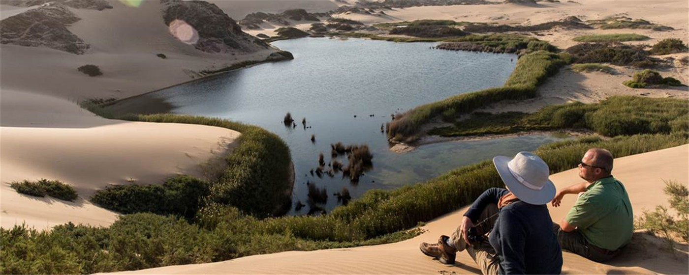 踏进世界上最古老的纳米比沙漠(Namib),登上地球上最高的沙丘,远古的呼唤从旷野传来,令人思维无限延展的空间。随着太阳的轨迹和光线的变化,沙流的颜色也不断的变化,配合着沙漠里形态怪异的枯树和沙丘给人一种宛如隔世的感觉。在沙漠中偶遇寻找水源的鸵鸟和剑羚,或目睹死亡谷(Deadvlei)干涸的泥土与一棵棵孑然矗立的干枯骆驼树干。仰望夜空,星罗棋布,银河在眼前展开,真实地感受宇宙画卷的震撼。