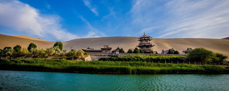 月牙泉,梦一般的谜,千百年来不为流沙而淹没,不因干旱而枯竭。在茫茫大漠中有此一泉,在黑风黄沙中有此一水,在满目荒凉中有此一景,深得天地之韵律,造化之神奇,令人神醉情驰。“晴空万里蔚蓝天,美绝人寰月牙泉,银山四面沙环抱,一池清水绿漪涟”。