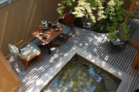 2006年作为大谷山庄的别馆开始迎客,很多人一定会同意,別邸音信最美的一景,就是来自入口处的一方水盘,清浅水镜映照天空,水天一色的美让人念念不忘。走近玄关,又是另一个流泻绿意的半露天空間,似乎走进南国小岛的度假村,一般文泉旅馆必有的迎宾茶点,并不在玄关接待处享用,而是角落另开的一屋雅致日式茶室。