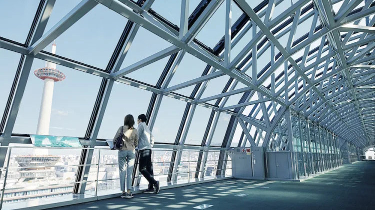抵达后,参观充满艺术气息的京都站由日本著名建筑师原广司所设计,采用钢骨结构配合玻璃幕的创意理念,在古色古香的京都街头,建造当初还引发一场现代与传统的激辩。搭乘长长手扶梯至顶楼天空展望台,可一览其建筑之美,近距离与京都塔合影!车站地下街的“京都Porta”、站内的“ASTYSQUARE”,以及车站对面京都塔内的“KYOTO TOWER SANDO”,各类店铺琳琅满目,让旅客更能体会京都这座城市的魅力。