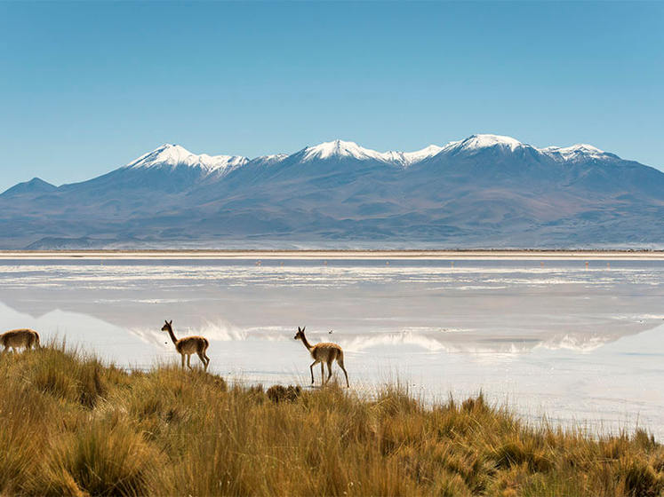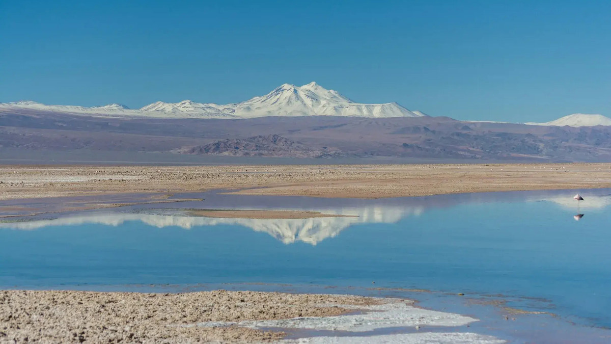 阿塔卡马盐湖是智利最大的盐湖,位于阿塔卡马沙漠中心,以白色盐壳、碧蓝泻湖和安第斯火山背景闻名。夏季能看见火烈鸟在浅水区觅食的景象,超级梦幻!
