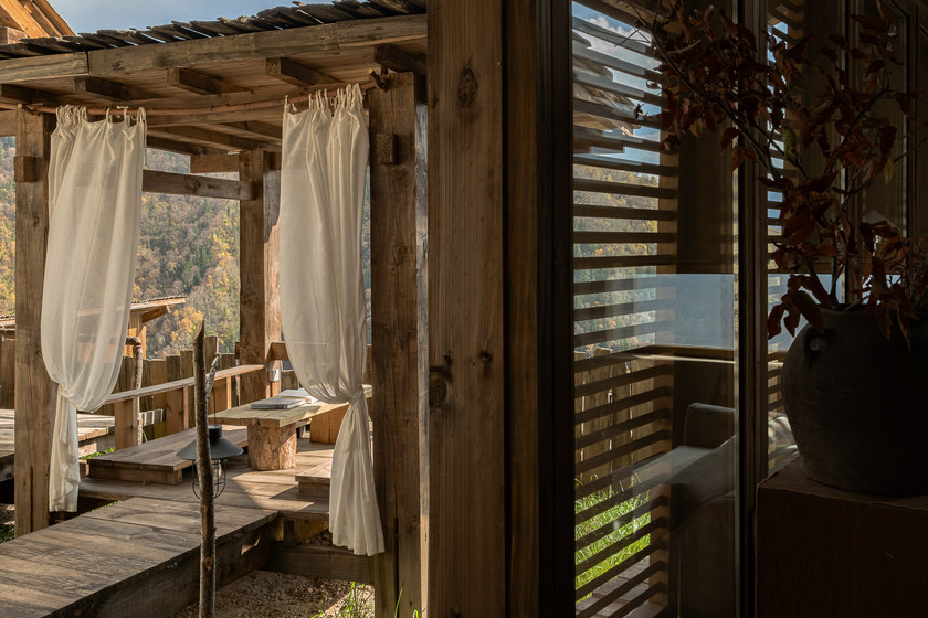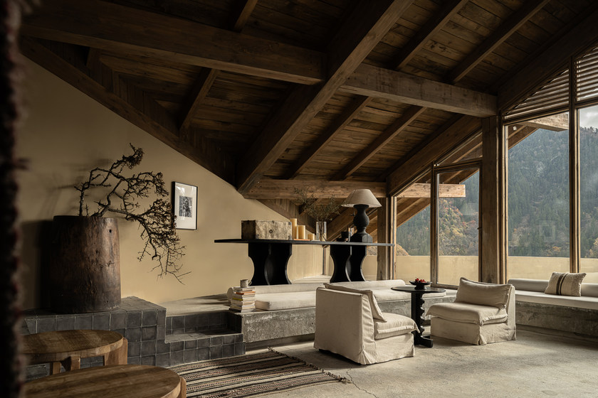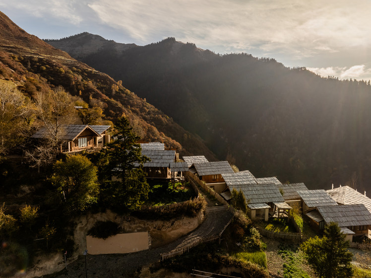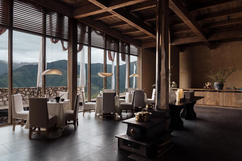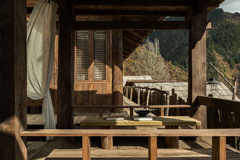 酒店临着山脊线而建,处于羊足山阳坡,2800米的高度可以远眺雪山(岷山山脉)与松柏森林交相辉映,可俯瞰峡谷壮丽的日出日落。建筑风格延续了原有藏寨的纯木结构,修新如旧,山形屋顶盖使用藏寨古村落的木质瓦片,最大限度保留了原有村寨风貌,整个酒店散发着天然高远的气息。