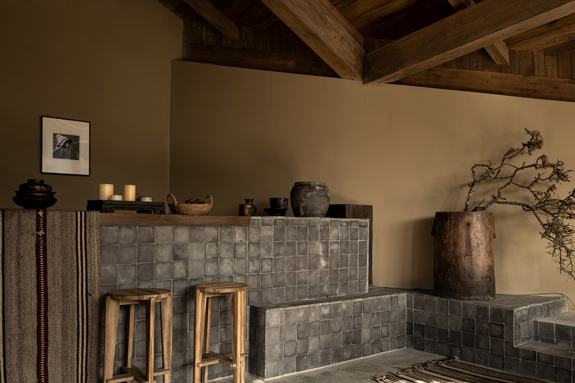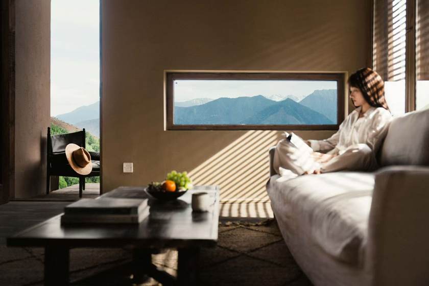 咏归川·九寨度假酒店在古寨旧址上保留原始结构特点,用现代设计语言结合藏式木楞板山形屋顶、夯土结构建造了12座80-240㎡的独栋别墅。房间部分材料采用原始木屋的建筑木料重新加工,木瓦片经过洗礼再次成为建筑的一部分,为房间内外注入了羊足山古朴的肌理质感。