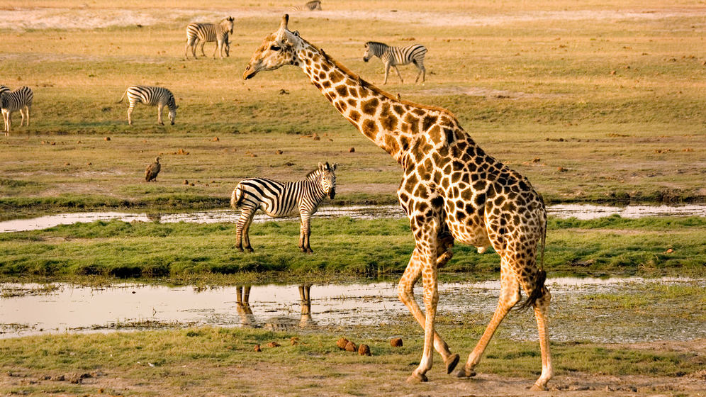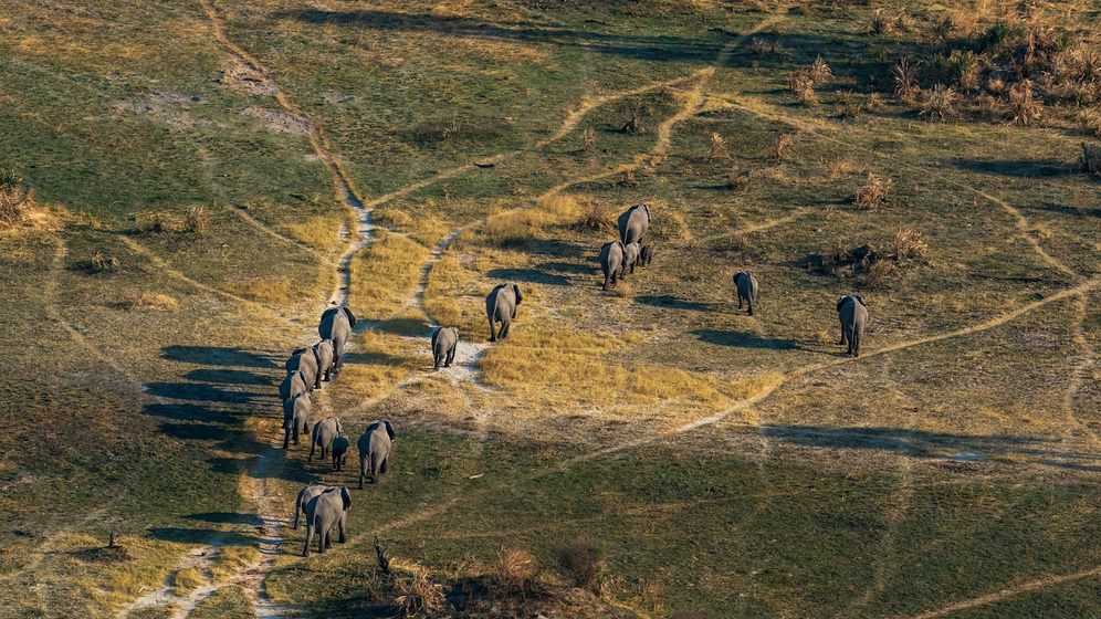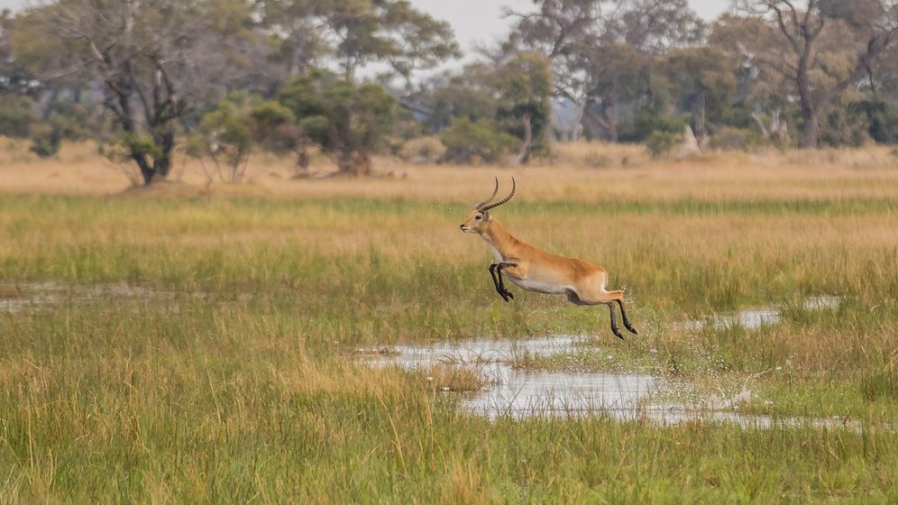 这片非凡之境随季节性洪水的涨落不断演变。每当洪水涌入之时,就会编织出沼泽迷宫、小型林岛与浅水泻湖的景观。在三角洲边缘,陆地与水域模糊交融:象群家族在浅水道中踏水前行,长颈鹿群从地平线轮廓中渐次显现,优雅的薮羚则隐匿于芦苇深处。洪水退却时,林地与草原重现,捕食者与猎物之间的互动清晰可见。