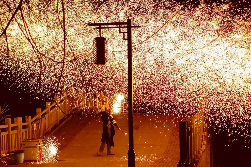 非遗打铁花源于北宋盛于明清,是新年里古人对未来美好生活的祈愿,是一场历史悠久的民间艺术与视觉盛宴;火壶来源于篝火,以火为煤,以壶为载,饱含“百年安宁”的祝福。这不仅仅是火树银花落,万点星辰开,更是传统文化带来的震撼与澎湃。