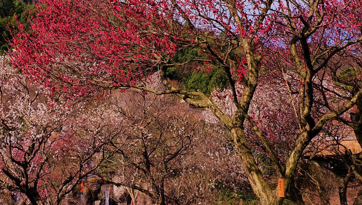 热海梅园的梅花号称是日本最早开花的梅花,包括树龄超过百年的梅树。梅园境内的梅树将近500棵,每年的1月到3月上旬都会举办梅花祭。园内除了赏花之外,还可能偶遇到艺伎、落语等各种表演,并免费提供甘酒、足汤等服务。