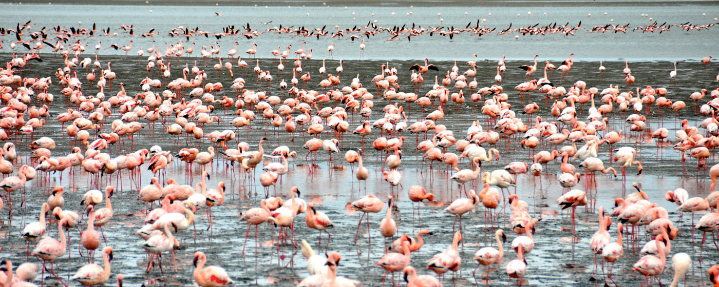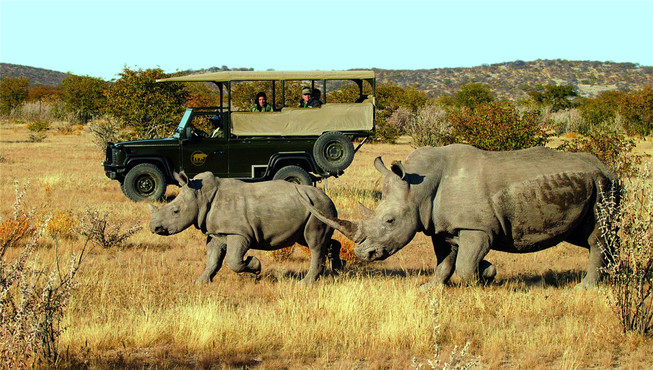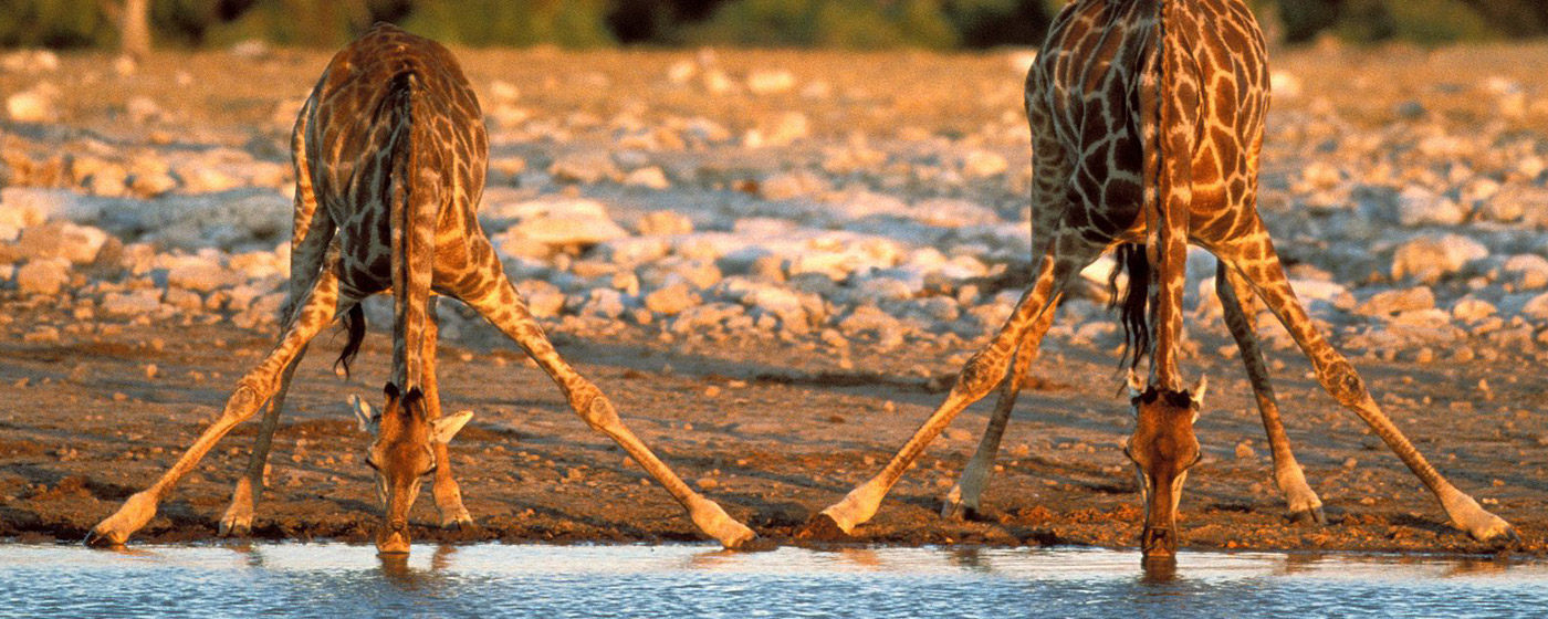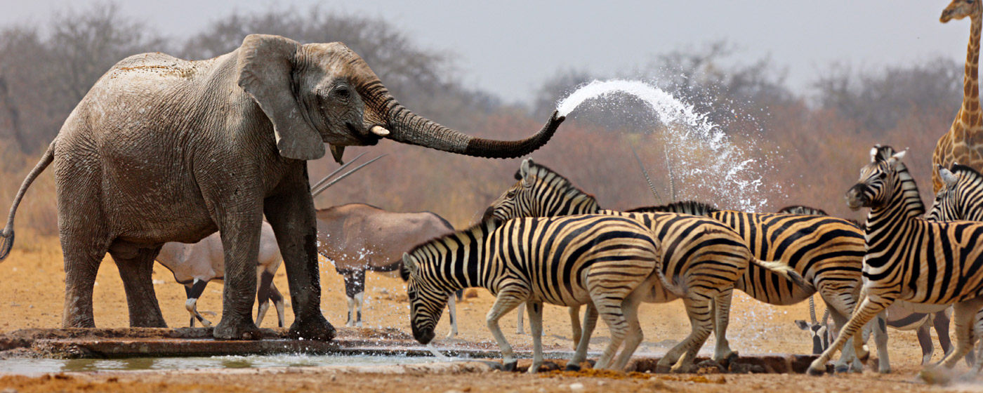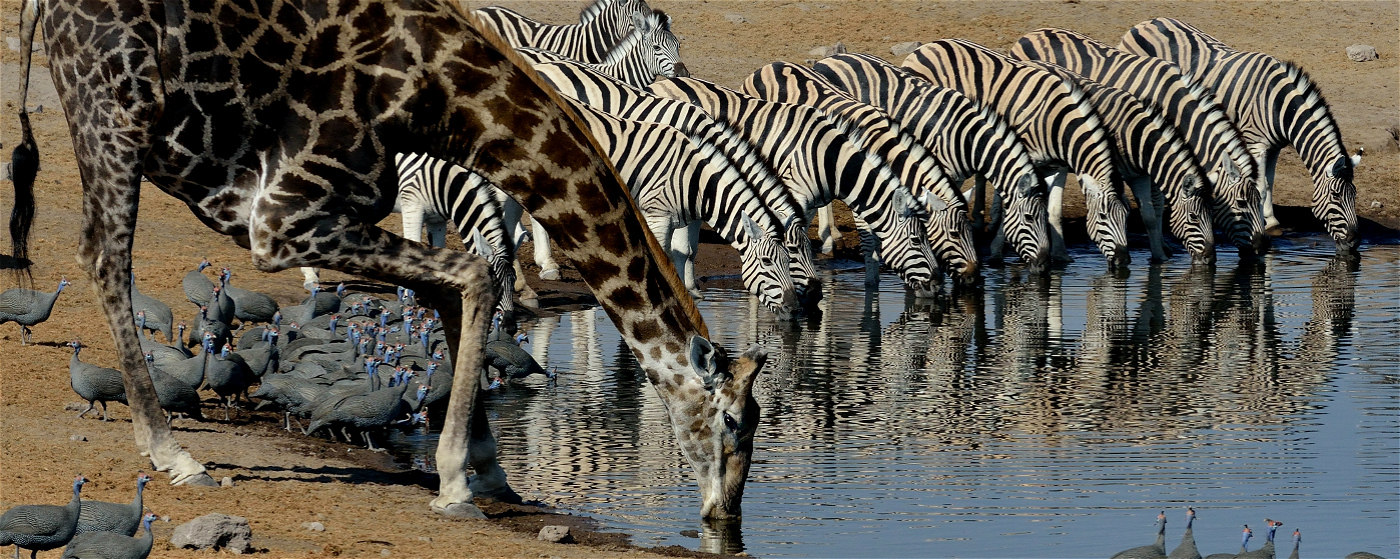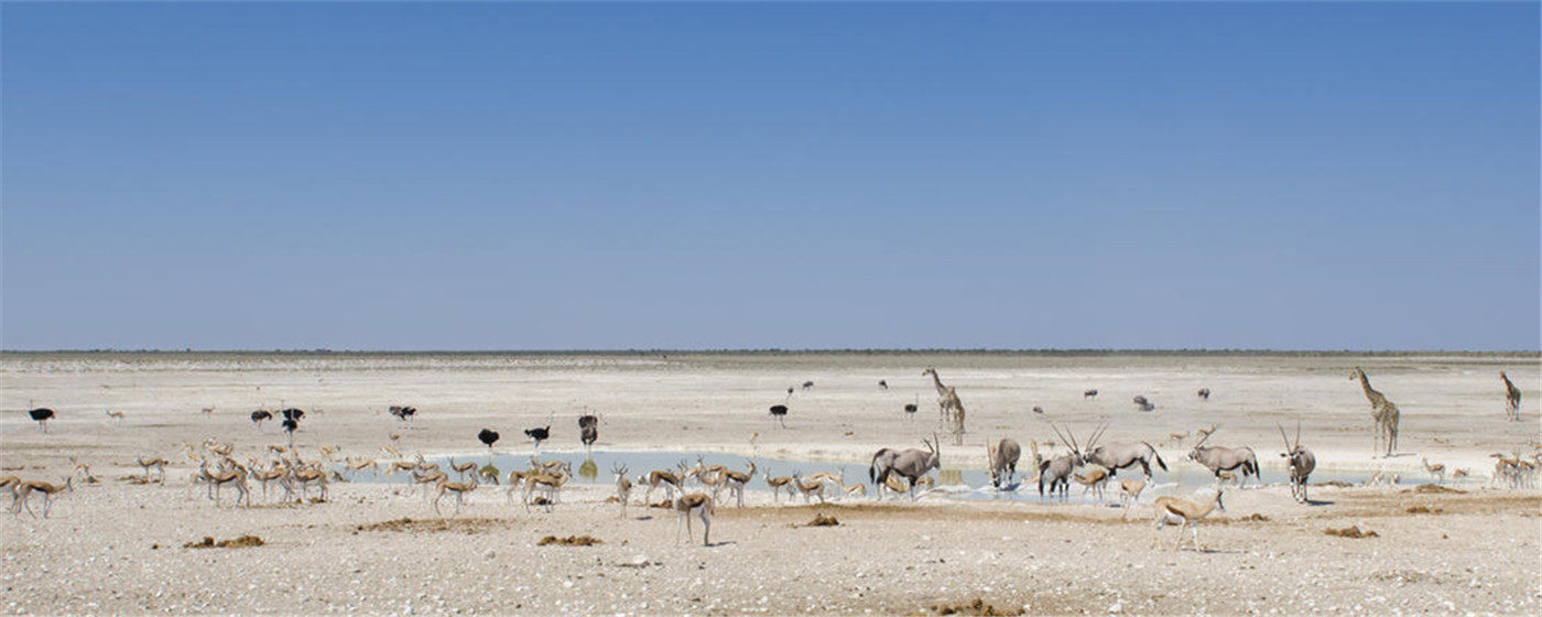 位于温得和克北部的埃托沙国家公园(Etosha National Park)是世界最大野生动物保护区之一,内陆平原与半干旱的沼泽地带中栖息着种类繁多的野生动物:犀牛、大象、猎豹、鬣狗、狮子、豹、猞猁、豺、土狼、小羚羊等。除兽类之外,还栖息着323种羽色各异的鸟类。夏天雨季来临,雨量充足,成群结队火烈鸟来到这里繁衍后代。而旱季时更容易看到大型野生动物群,只需要来到几处水塘,就可以看到众多动物,比如象群、斑马、羚羊、甚至狮子等在池边饮水,场面相当壮观。