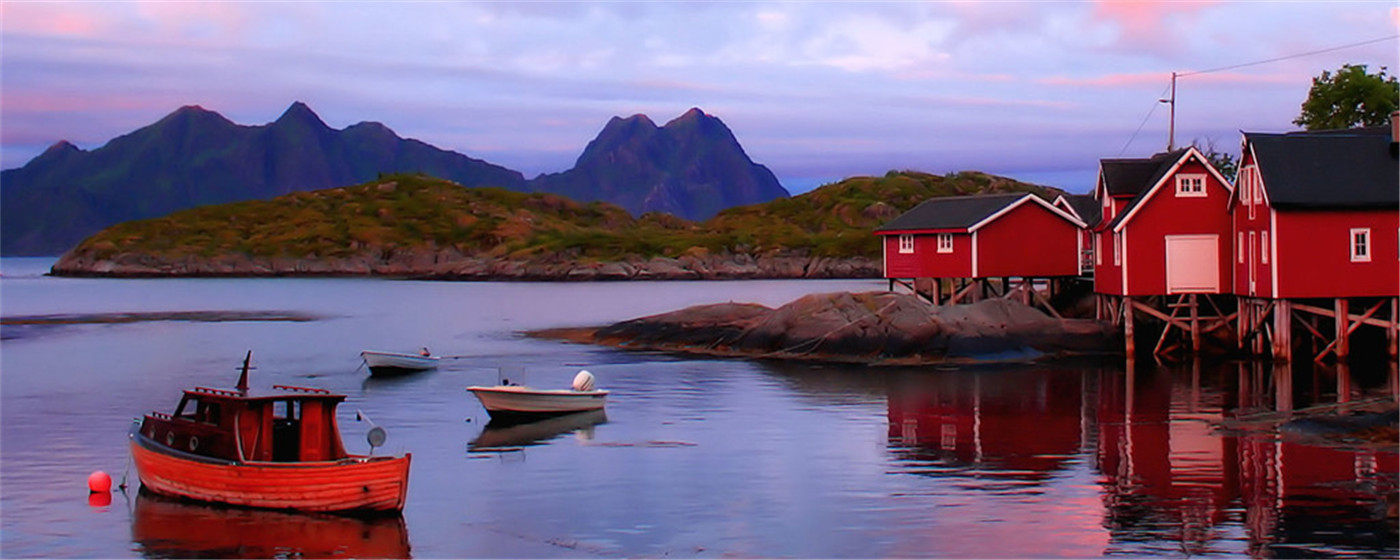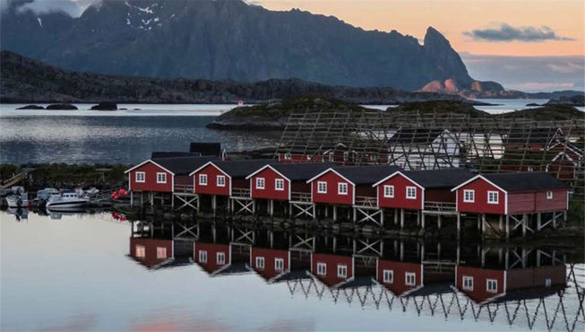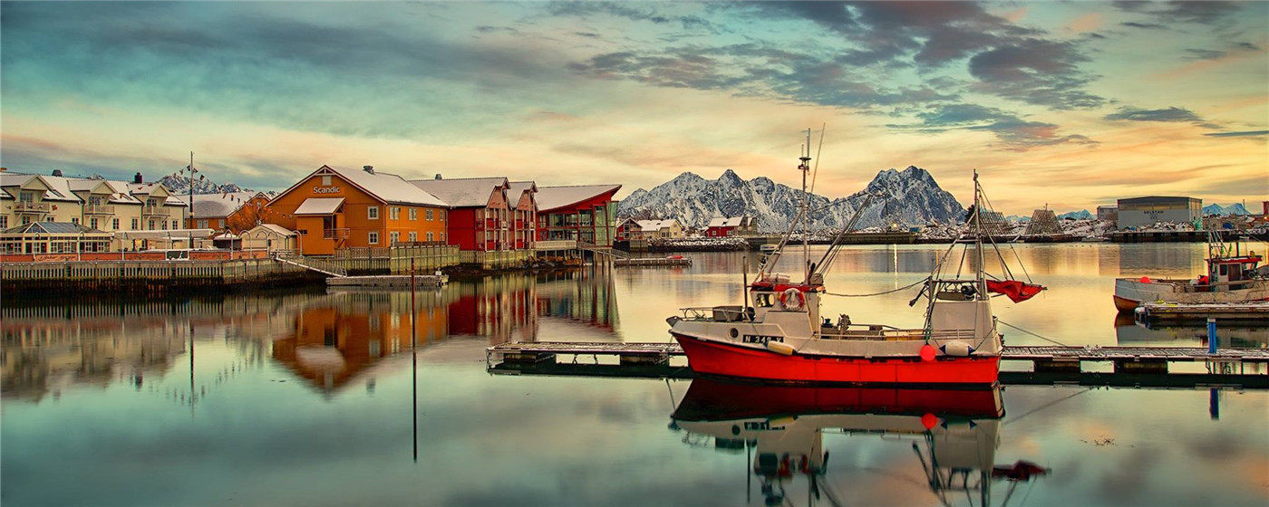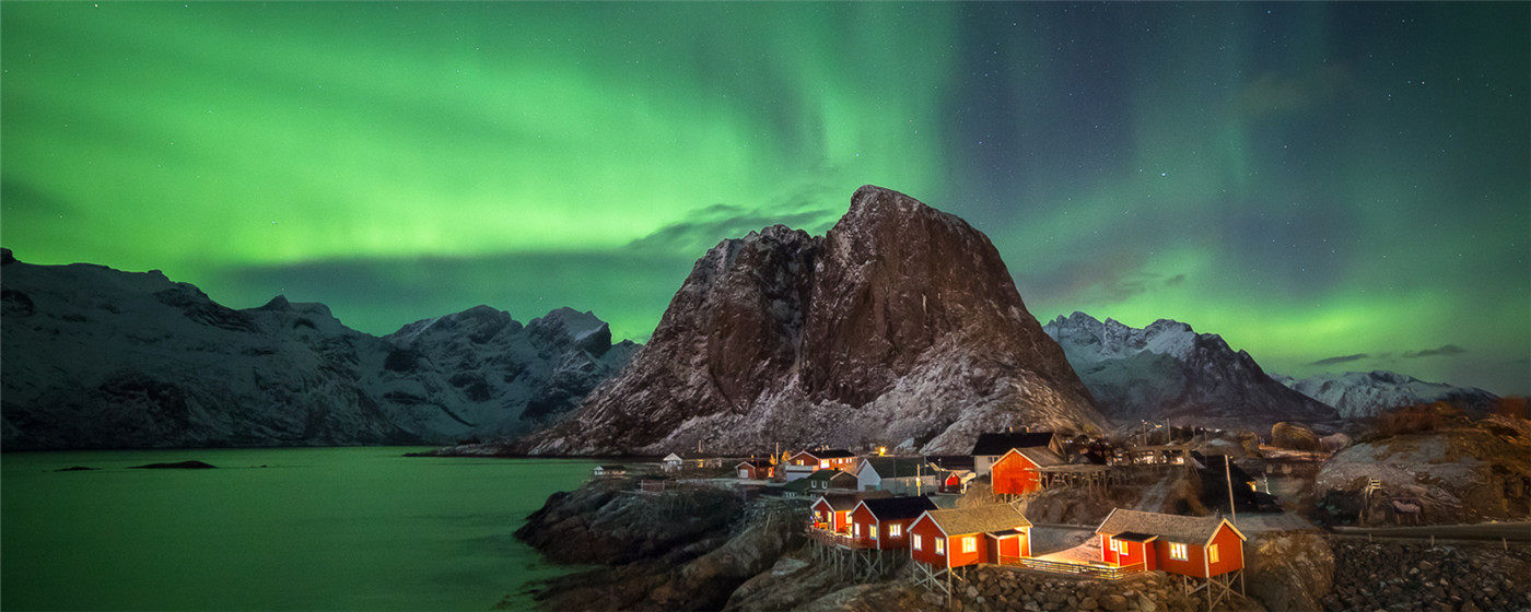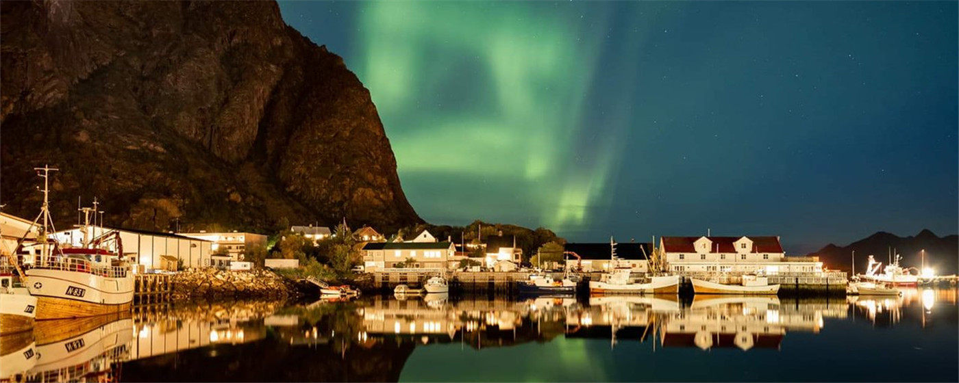 晚上乘坐飞机前往挪威罗弗敦群岛莱克内斯机场,专车接机前往群岛上的斯沃尔维沃小镇,入住峡湾特色的渔民小屋。这种被称为“Rorbu”的渔民小屋是罗弗敦群岛上特色最鲜明的符号,红白相间的迷人小木屋在水畔的岩石上挺立,被群山环抱,与海岸线完美贴合,房屋主体在陆地上,但是有一边支脚会伸出并架在水面上,以方便渔民登船,饱含令人神往的渔村生活气息。我们将入住位于美丽海湾的斯温诺亚罗布尔酒店(Svinøya Rorbuer)的小屋,这里不仅沉浸山光水色中,而且拍摄极光角度极佳,因此成为摄影师和极光迷们的理想选择。