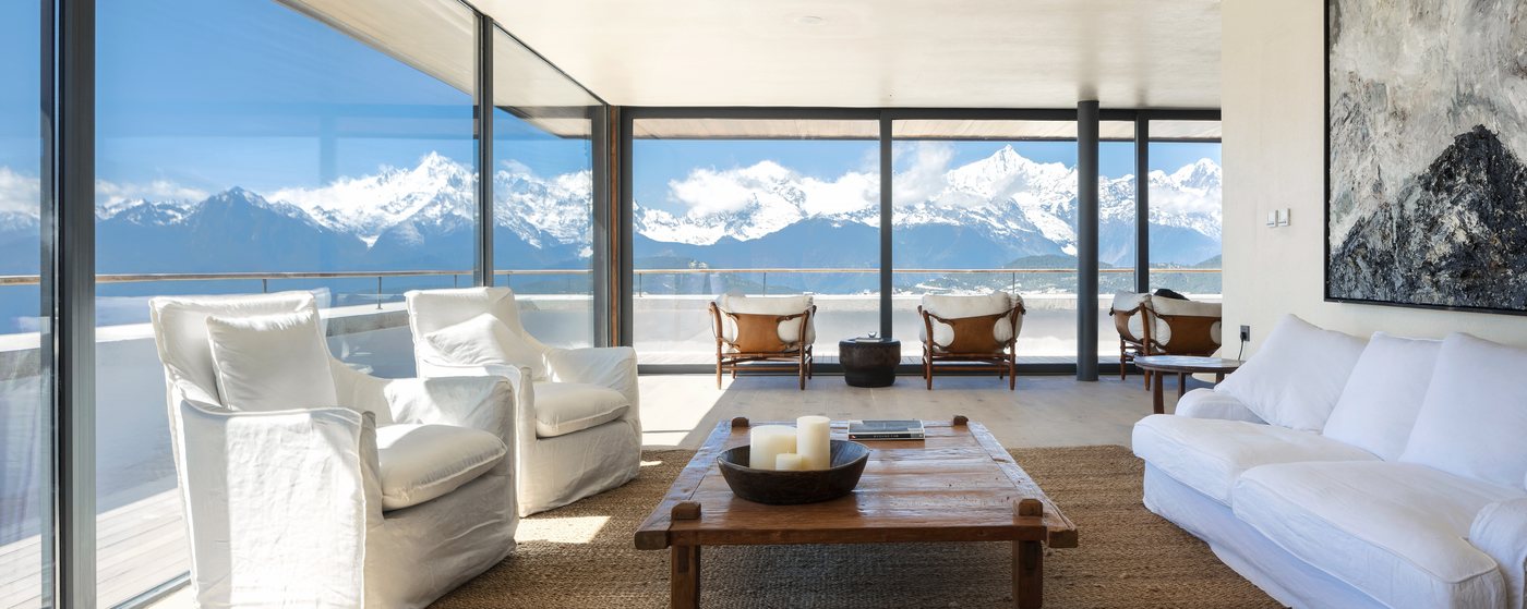 位于海拔3600公尺之上的「既下山梅里」设计饭店,矗立于中国云南省德钦县雾浓顶村与绵延不绝的梅里十三峰与主峰梅里雪山对望,大厅更打造绝美环景落地窗能直接远观欣赏,有如沉浸式体验般能近距离感受大自然壮阔的景象,一年四季无论何时远道千里而来,都能静静地感受梅里雪山一整天的山景与光影变化。