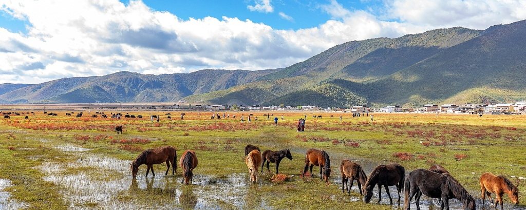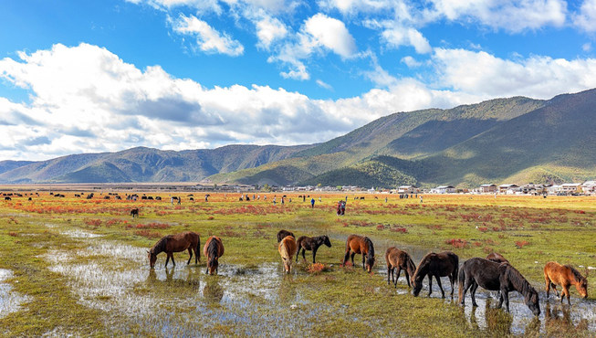②纳帕海环湖游览:纳帕海景致随四时而变,湿地和湖水交叉着形成了鲜明的层次,牛马在湿地上嬉戏着或信步水中,传统的藏族村庄点缀在纳帕海旁、一派和谐景象。