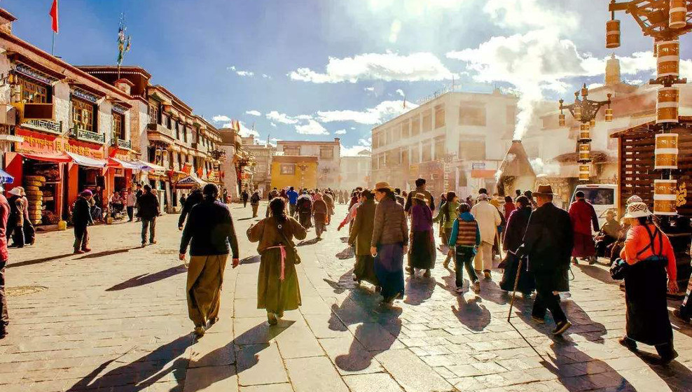 下午可游览大昭寺外著名的转经道--八廓街。八廓街原街道只是单一围绕大昭寺的转经道,藏族人称之为“圣路”,距今已有1300多年的历史。在藏语中,“八廓”是“中转经道”的意思,是拉萨著名的转经道和商业中心,较完整地保存了古城的传统面貌和居住方式。