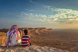享用午餐后前往世界之崖。站在法哈林山(Jebel Fihryan)令人叹为观止的世界之崖上,眼前与天边壮景都是值得捕捉的壮景。这里距离利雅得90公里,属于绵延的图崴(Tuwaiq)断崖,徒步旅行者可以从一系列路线中选择到达山崖顶部,欣赏绝壁沙原。