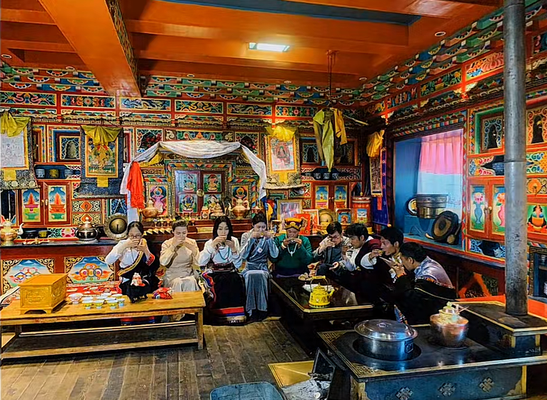 拜访藏族家庭,主人会给我们献上哈达,用手指沾上青稞酒弹洒3次,并告诉我们第三次可以朋友间互相弹洒。伴着酥油茶的丰厚香醇,听马帮帮主向我们娓娓道来马帮的过去和历史。