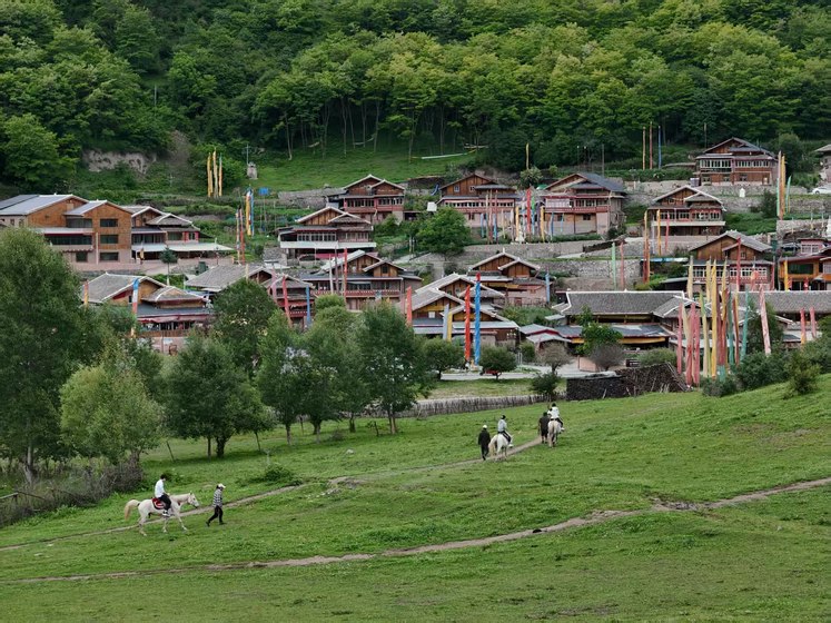 前往如画风景的中查沟骑马,在牵马人的陪同下,缓缓穿越林地牧场,看雪山下五彩的村子,和当地人一样的去挂经幡祈福、撒隆达。