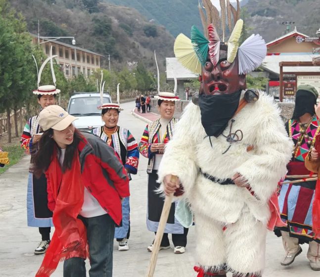 行程中特别安排了白马藏族专属非遗体验,当贵宾踏入九寨沟白马藏寨,桥头身着传统服饰的乡亲早已手捧哈达青稞酒列队相迎,为我们献上独有的欢迎仪式“跳酬盖”。“㑇舞”和“熊猫舞“非遗老师等侯在广场,待贵宾到来,戴上他们本部落的标志性面具后,驱邪祈福的歌舞表演就开始了。
