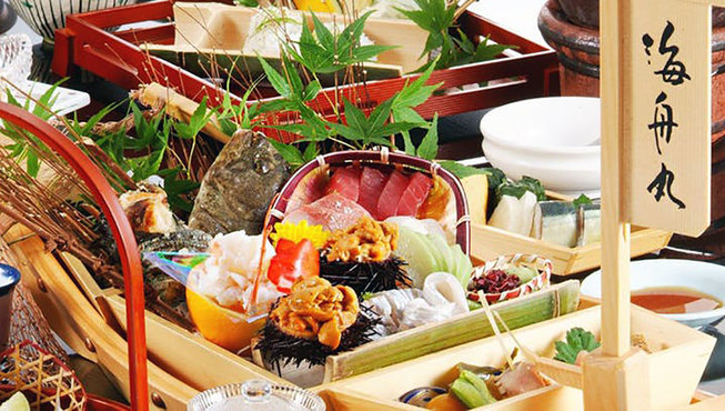 滨千鸟之汤 海舟也收到黑潮暖流的恩赐,丰富的海鲜和新鲜的山珍尽数汇聚到您的餐桌上。旅馆的三餐应季节而变,选择也非常丰富,在温泉中消解疲劳后,美食的滋养正好为身心送去力量。
