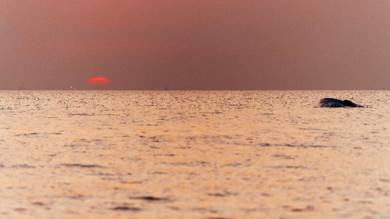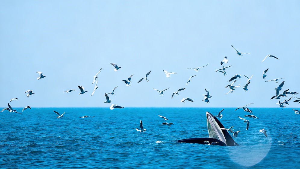 涠洲岛附近海域,是我国近海已知唯一大型鲸类稳定的活动场所——鲸鱼在这很常见!它们依赖珊瑚礁培育的丰富鱼群为食,而珊瑚礁又因火山岩基底的特殊环境得以保育,形成“火山-珊瑚-鱼群-鲸鱼”的完整生态链。每年 11月下旬至次年 4 月是布氏鲸活动最频繁的时期,在天气暖和、风平浪静的日子最适宜寻鲸。空中盘旋聚集的海鸥群是最显著的信号——每当布氏鲸出水换气时,海鸥会立刻蜂拥而上,试图从鱼群中“捡漏”。