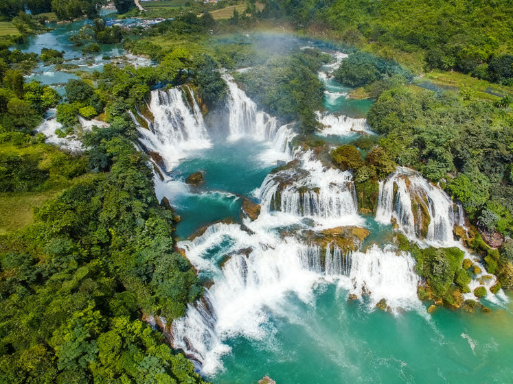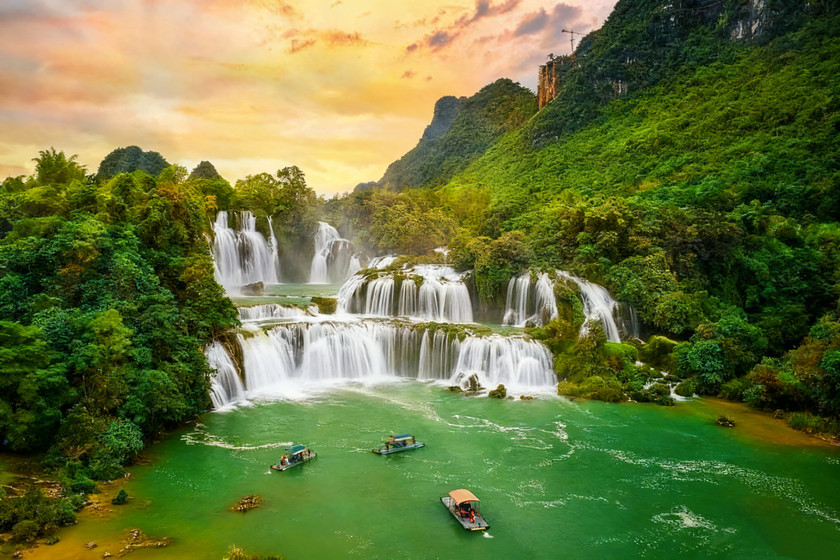 包竹筏观赏德天跨国瀑布澎湃气势,在瀑布下游的河水中缓缓靠近巨大水幕,近距离体验飞珠溅玉扑面而来。