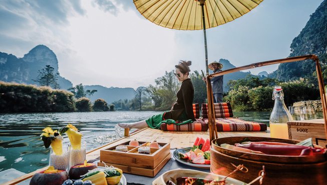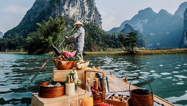 丽世岛 AFLOAT,为山水与美馔而生,灵感源自庄子“泛若不系之舟”,主厨顺应四季,取中越山野之味,以季节之丰,书写河畔之飨,由食,至心。