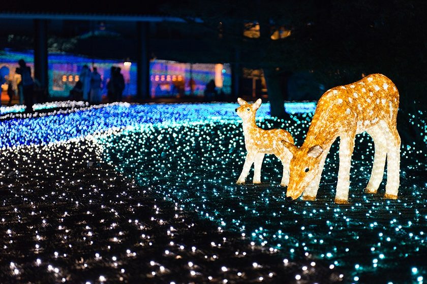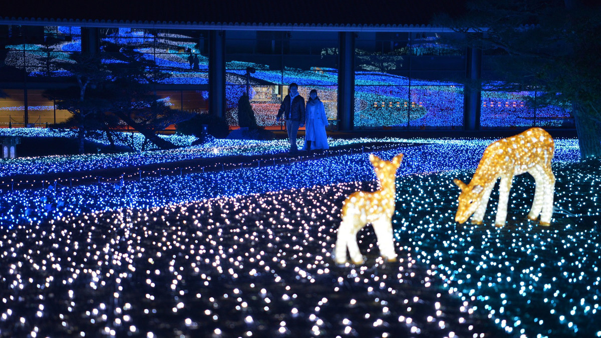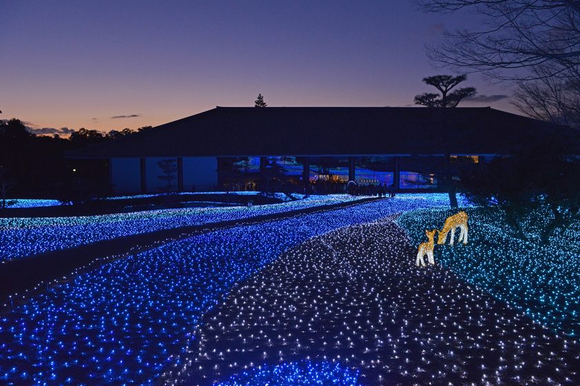 晚间可跟随向导前往游览期间限定的奈良琉璃绘(2026.2.8-2.14)。蓝色灯海,幸福回廊,于奈良公园内,东大寺东侧。活动期间,东大寺、兴福寺、春日大社3处世界遗产与奈良公园内多处开放夜间参拜,点亮琉璃色灯光秀与灯光道。还有琉璃绘市集提供温暖小吃与热饮。