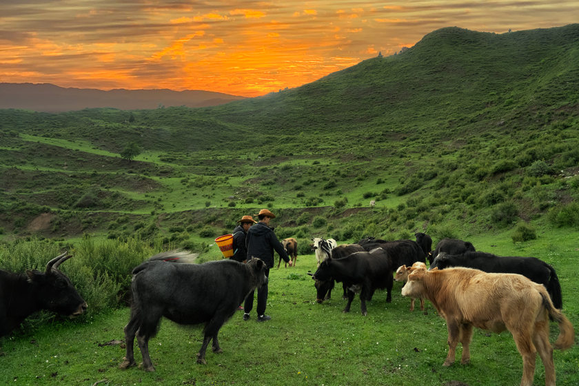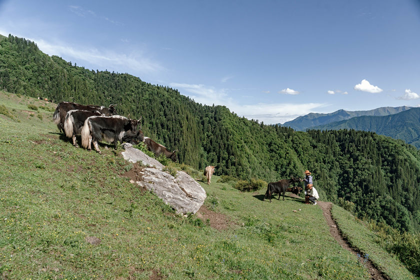 在咏归川·九寨再往上,是一片高山牧场草甸,到处是漫游吃草的牛羊,沿着徒步线一路向上,草甸连绵、山风清扬,如同一幅自然的画卷,细心观察,处处能遇见不一样的风景。