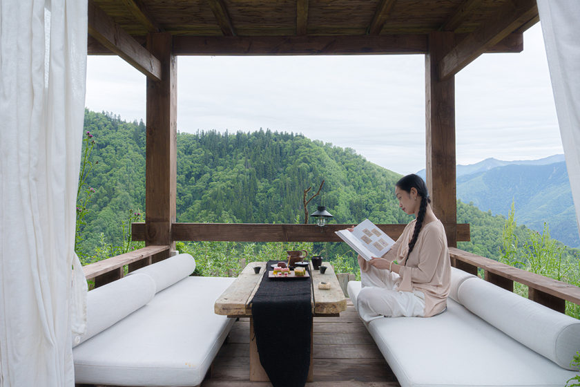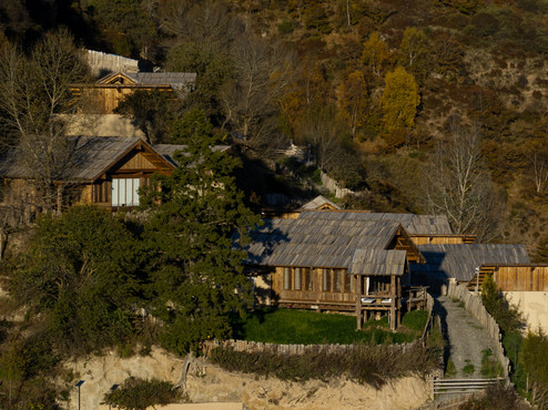 酒店临着山脊线而建,处于羊足山阳坡,2800米的高度可以远眺雪山(岷山山脉)与松柏森林交相辉映,可俯瞰峡谷壮丽的日出日落。建筑风格延续了原有藏寨的纯木结构,修新如旧,山形屋顶盖使用藏寨古村落的木质瓦片,最大限度保留了原有村寨风貌,整个酒店散发着天然高远的气息。